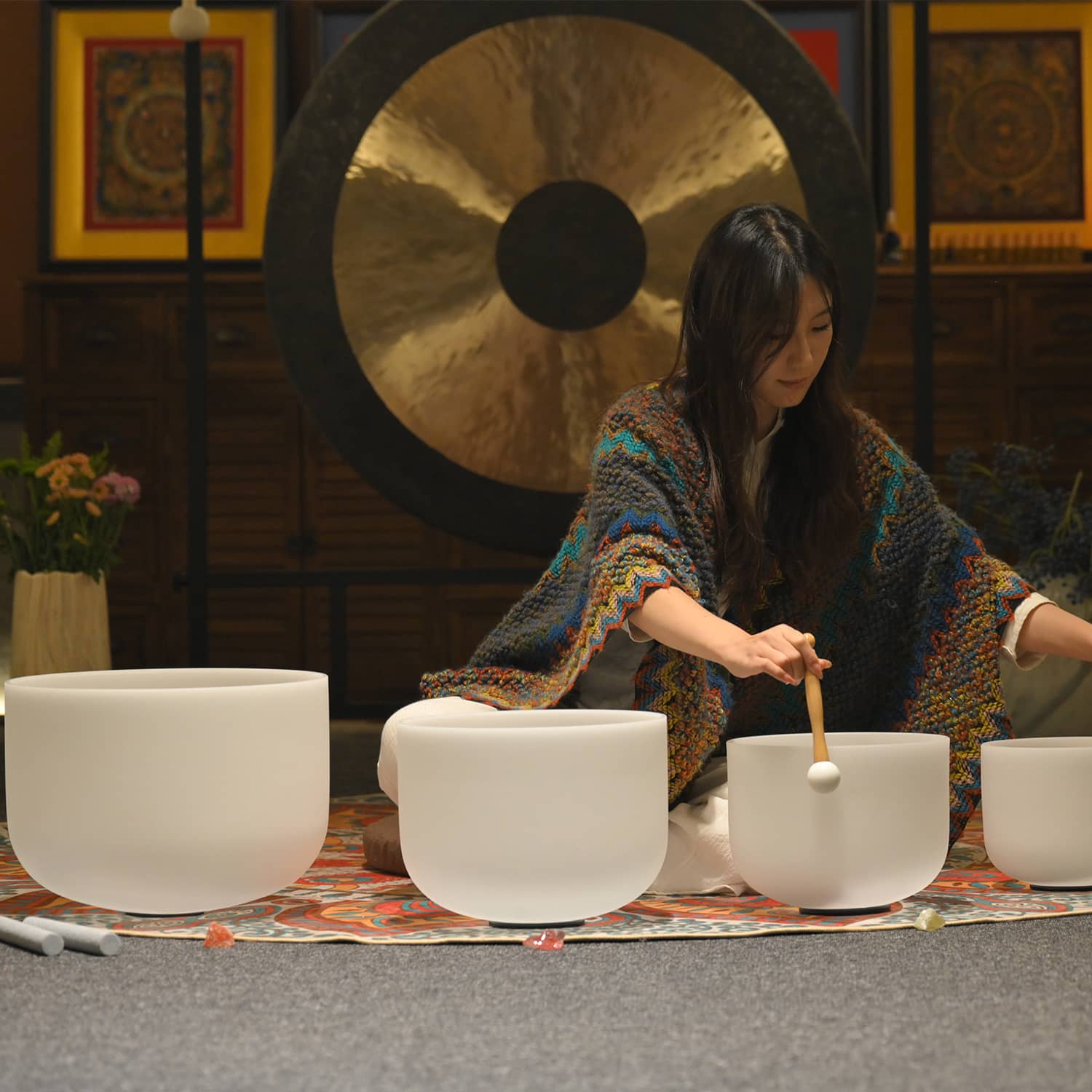You begin to learn how to play the crystal singing bowl in right way and feel the sound power from the crystal singing bowl. You begin to adjust the sound and feel the sound by your body.