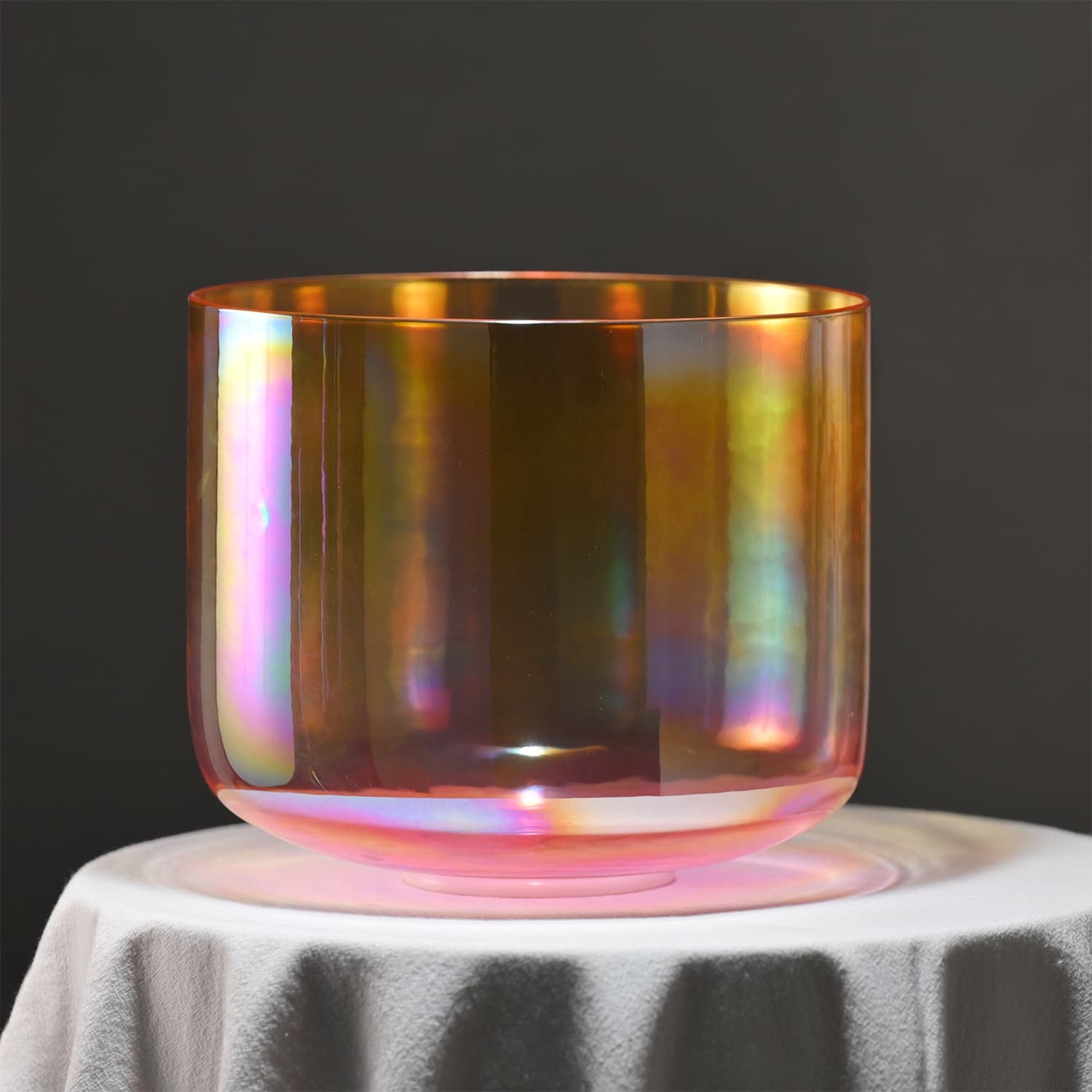 Alchemy singing bowls are made from 99.9% pure Quartz crystal, a naturally occurring element. The fused crystal is heated to a temperature of over 4000 degrees and blown into shape in a process similar to hand blown glass. The process in which the alchemy singing bowls are manufactured general puts them in a lower octave range than bowls of the same size in the frosted style. The tone of alchemy singing bowls is pure and long lasting. Alchemy singing bowls are known for clean sound and great resonance.